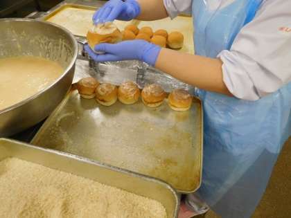焼きカレーパンは、市販されているカレーパンを、給食風にアレンジしたものです。給食室では、工程の都合上なかなか揚げることが難しいので、表面にパン粉をまぶし、それを焼くことで色をつけカレーパンに見立てました。具は大豆・ひき肉・人参にカレー味をつけ、パンに挟んでいます。とても手順の多いメニューですが、子どもたちも「おいしい!」と言って食べていました♪ 嬉しい限りです!