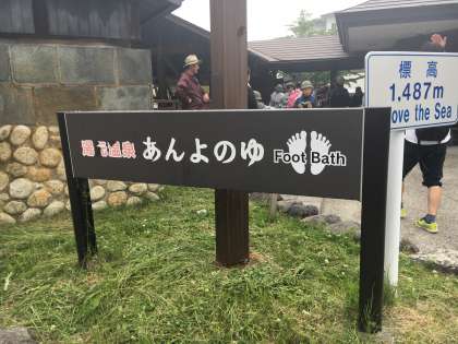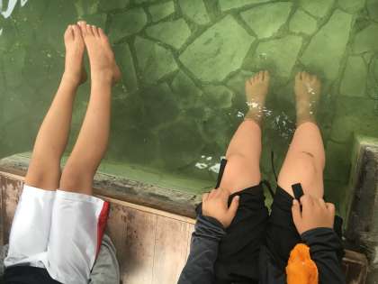 バスで湯元温泉に戻りました。クラスごとに分かれて足湯体験と源泉見学です。足湯は、温度がとても高いところがあり、まるで我慢大会のようでした。しかし、歩き疲れた足にとっては、気持ちの良い体験でした。