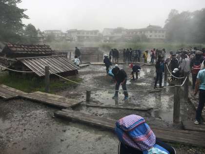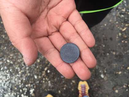 源泉では、持参した10円玉を、路上の温泉が湧き出ているお湯に入れて、しばらく待ちます。硬貨の色に変化が見られました。