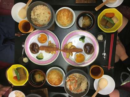 夕食です。釜飯、エビフライ、ハンバーグ、キノコのホワイトソースパイ包みオープン焼き、チョコレートムース等、とても豪華です。
