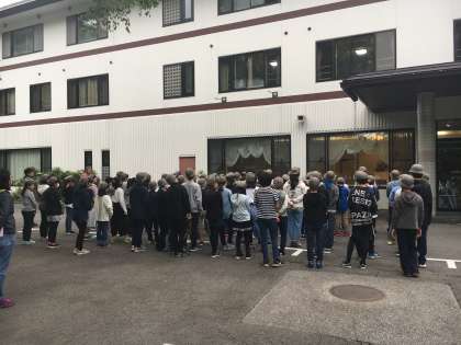 朝会です。体調を崩す子が一人も出ないで、5分前行動をしっかり守っている6年生。荷物の整理や部屋の片付けも協力して実施しており、大変立派です。