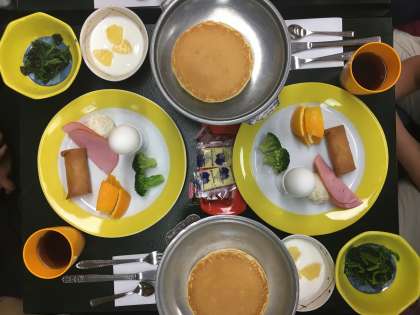 3日目の朝食は洋食です。鉄板のホットケーキをナイフとフォークで食べるスタイルです。