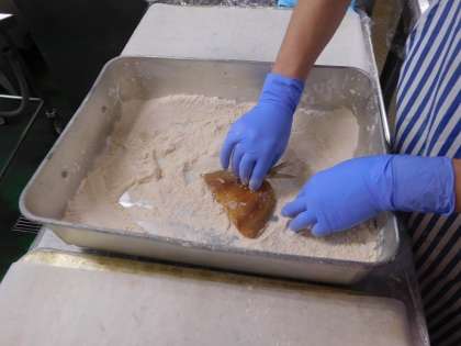 あじのカレー揚げは、初めてのメニューです♪あじのひらきを購入し、下味をつけたあと、片栗粉とカレー粉をあわせたものをまぶして揚げていきます。カレー味なので、とても良い香りがします。