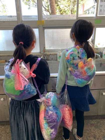 3年生のカラフルフレンドが完成しました!様々な袋を組み合わせたり、スズランテープの色を工夫したりして作りました。一人一人が工夫をして、個性豊かな作品を作ることができました。