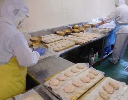 真砂揚げは、細かくした豆腐や人参や玉ねぎなど材料を丸めて揚げたものです。豆腐は水を切ったものを使用しています。一つずつ調理員さんが丁寧に形を整えて作ってくれています☆