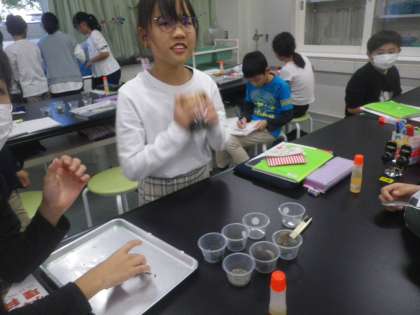 5年理科「流れる水のはたらき」という単元で川の上流・中流・下流の石の形がなぜそれぞれ違うのかを考えました。水で運搬された岩がぶつかり合って、丸くなったという予想を確かめるためにビンにスポンジを入れて振ってみると、見事にスポンジの角が取れて丸くなりました。