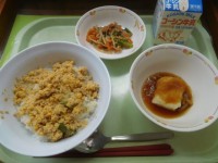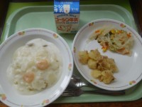 大きなじゃがいもがゴロゴロ入った、肉じゃがです。おうちで食べる肉じゃがよりも汁気が多く感じられたと思います。じゃがいもをつぶさないためと、食べやすくするためです。給食では、メークイン系の煮くずれしにくい品種(ひんしゅ)を使っています。男爵(だんしゃく)系の品種だと、煮込むことでホロホロとくずれやすくなり、ほっこりと仕上がります。じゃがいもには、たくさんの品種があり、色も白や黄色、オレンジ色、むらさき色などがあります。調べてみてくださいね。