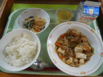 ごはん・四川豆腐・塩ナムル・梅ゼリー・牛乳