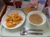 今日の給食は ・スパイシーピラフ ・ポテトのチーズ焼き ・オニオンスープ ・牛...