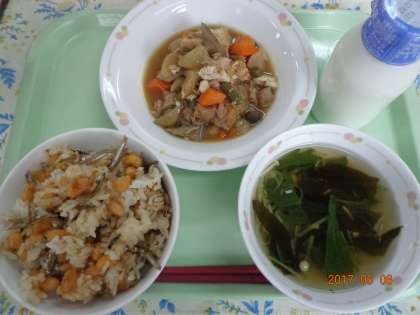 小魚を甘辛く煮たものですが、給食では大豆を