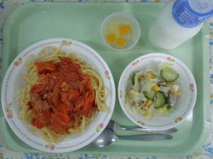 トマトの酸味のスパゲティに、フレンチドレッシングの