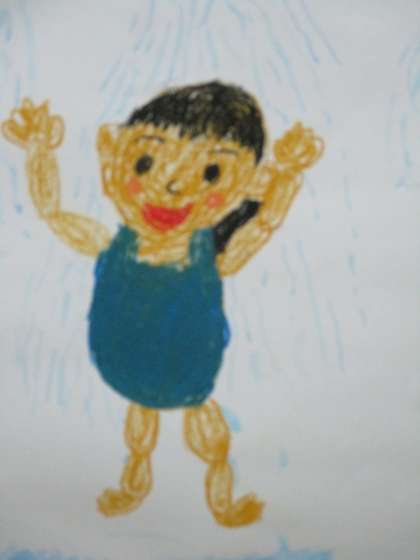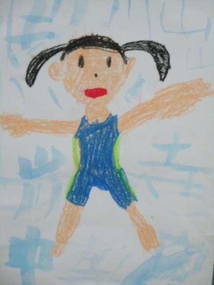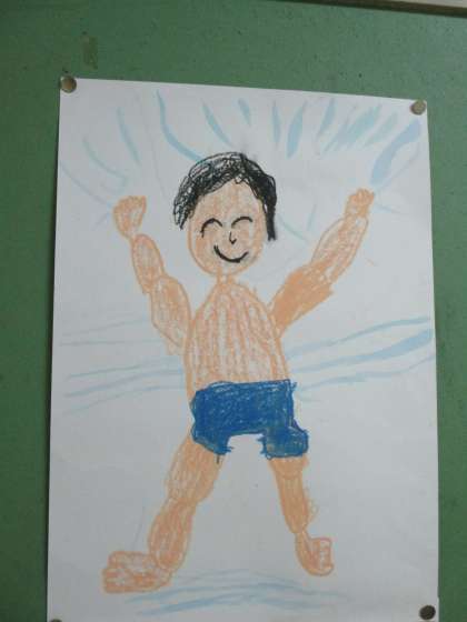 人間を描くのは意外と難しいので、人間の模型を使って色々な動きをやってみて、クレヨンで描きました。最後は、絵の具でシャワーの水を描いています。