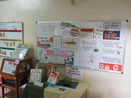 そこで、図書司書さんと栄養士さんが、読書推進のための給食と読書のコラボを考えてくれました。詳しくは、後日紹介しますが、給食メニューをきっかけにして、より読書に興味を持ってもらいたいとの願いからとのことです。給食室前の掲示板がいっぺんに賑やかに華やかになりました。