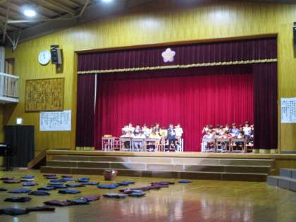 写真は、本日3校時の体育館の様子です。2年生が、ぽんぽこ の通し稽古をしていました。体育館に入っていった時は、稽古開始直前だったのですが、私に気がついた子どもに、校長先生役の子どもを紹介されました。ワイシャツにネクタイ、そして眼鏡。私の何倍も可愛らしい校長先生でした。本番が楽しみです。