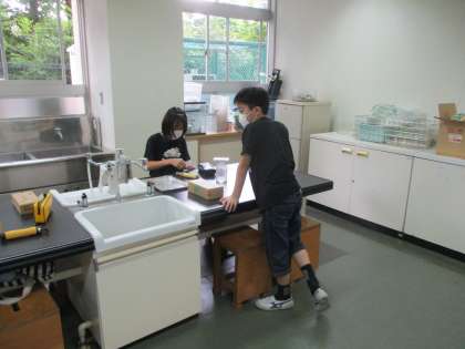 密集、密接を避けるために、分散登校している半分の児童をまた半分に分けて、9人で理科室の1実験台1名で実験を行っていました。