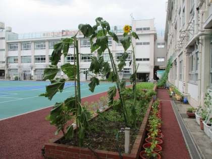 〇写真上:7月7日の向日葵です。背の高さは2mくらい、すくすくと育っています。(背が高すぎて風が吹くと大きく揺らぐので、支柱を立てて結んでいます。)