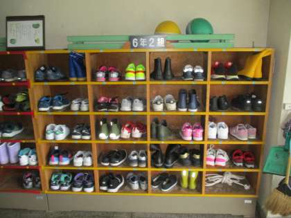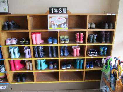 雨の日の靴箱の様子です。6年生の靴箱はもちろん、1年生の靴箱もとてもきちんと使われていました。長靴をきちんとしまうのは難しいのですが、さくら小学校の子供たちはとてもきちんとしています。(1年生の靴と6年生の靴を比べると大きさがずいぶん違います。大き目の長靴もきちんとしまっている6年生、さすがです。)