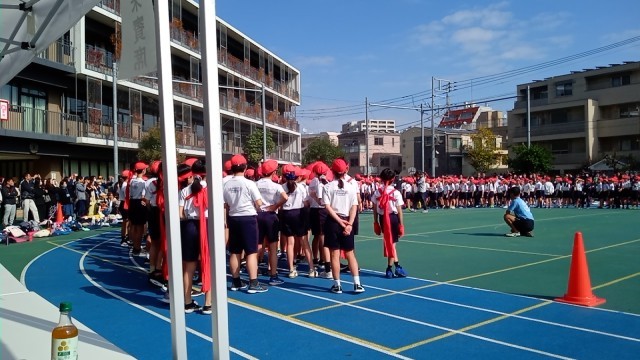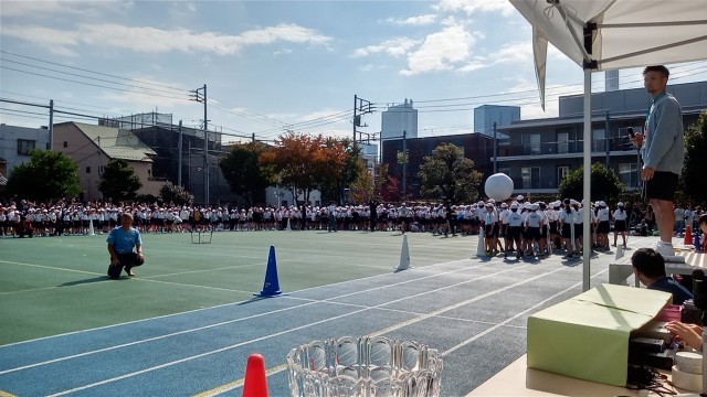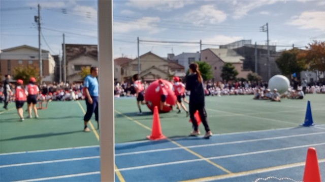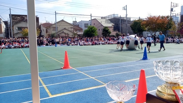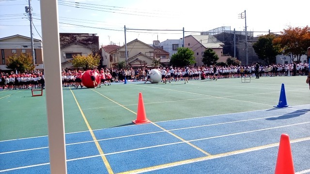 全学年による大玉送りです。一回戦は赤組、二回戦は白組が勝ったため、決勝戦を行い、白組が勝ちました。