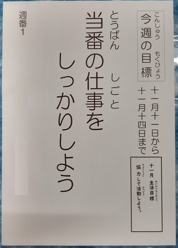 今週の目標は、「当番の仕事をしっかりしよう。」です。各学級での係活動や掃除当番など、自分の仕事をしっかりしていきましょう。