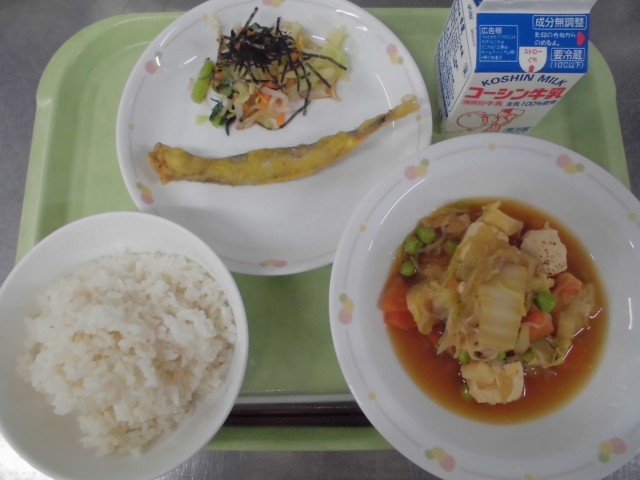 今日の給食の牛乳、ししゃも、豆腐、小松菜はカルシウムが多く含まれています。