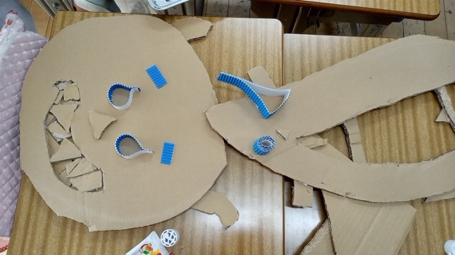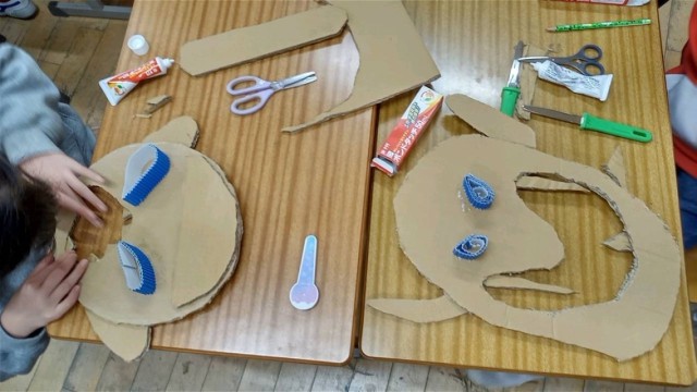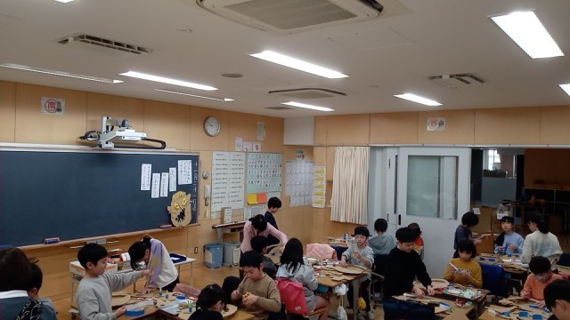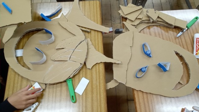 3年生の図工で、段ボールを使ってお面を作っています。ダンボールの色も生かしたお面になっています。みんな楽しそうです。