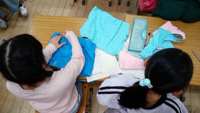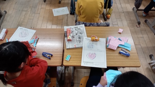 2年生の図工で色画用紙を手でもみほぐして袋にして、キャラクタを作ります。最初に作りたいものを図に書き、それをもとに作成しています。