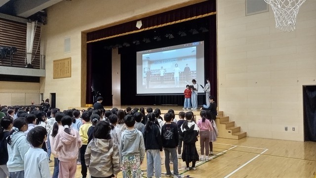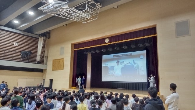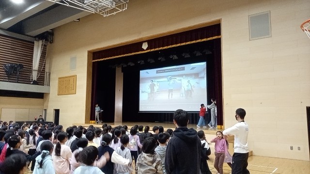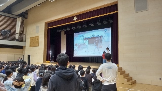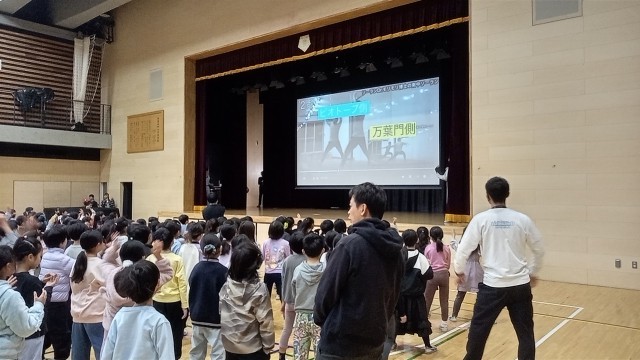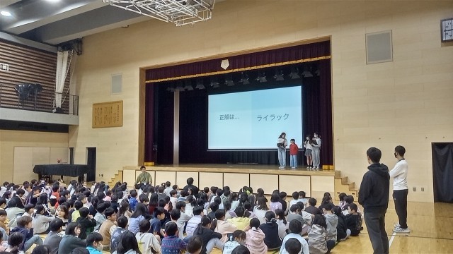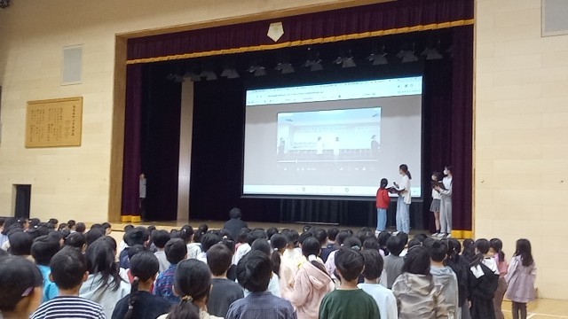 本日の児童集会は、集会委員会による運動会のどの学年のダンスかを当てる、「イントロダンス集会」でした。運動会の演目のダンスの曲のイントロを聞いて、あたりだと思う学年のダンスをみんなで踊るというクイズでした。