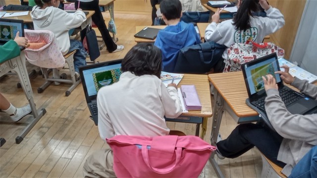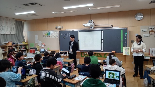 4年生が外国活動で、タブレットを使っていちごパフェを描き、何が入っているかなど英語で説明していました。