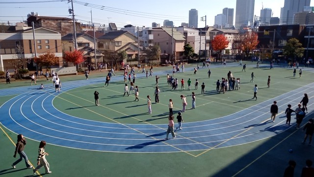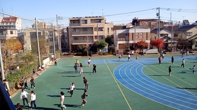 今日は青空が広がっています。子供たちは元気よく校庭で遊んでいます。