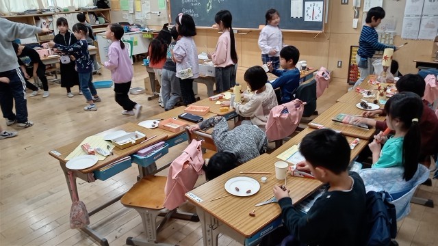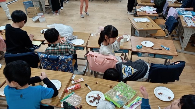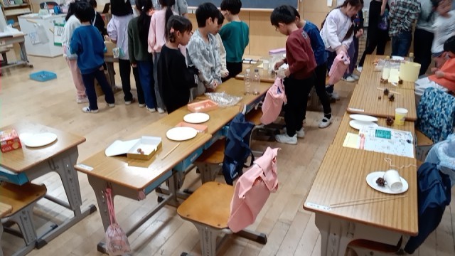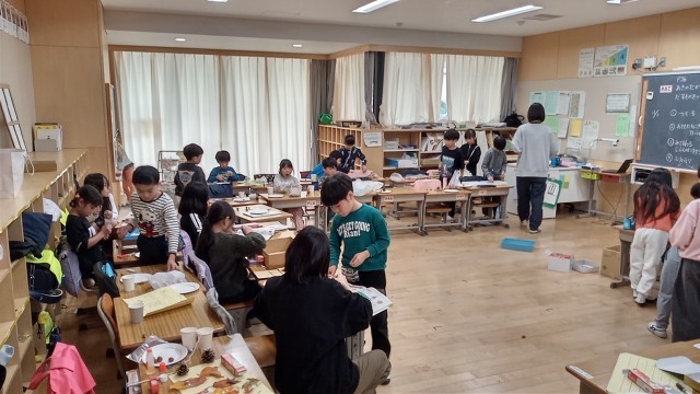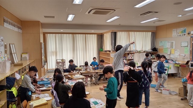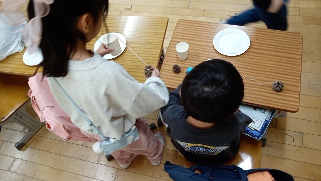 1年生の生活科で、どんぐりや落ち葉を使っておもちゃ作りをしていました。どんぐりゴマや松ぼっくりで作ったけん玉など、楽しそうに作っています。
