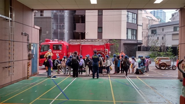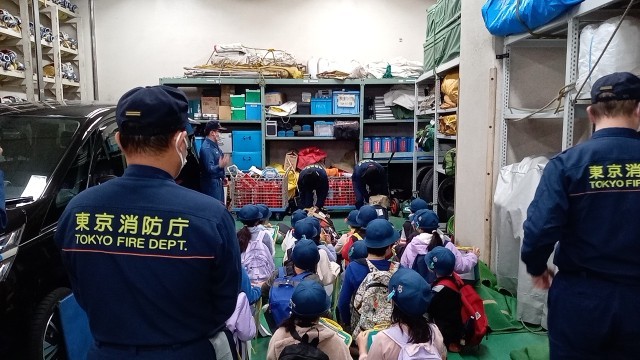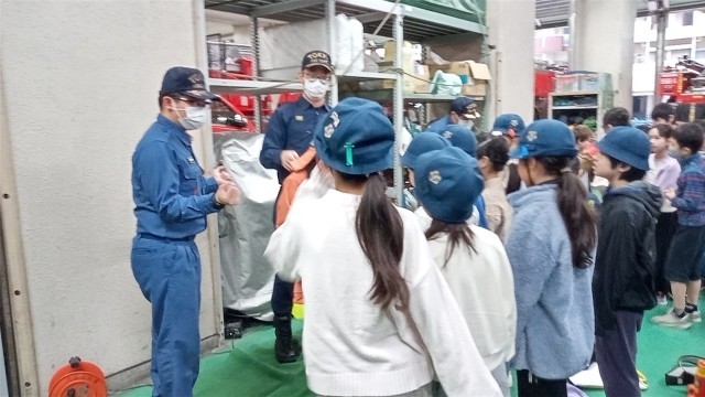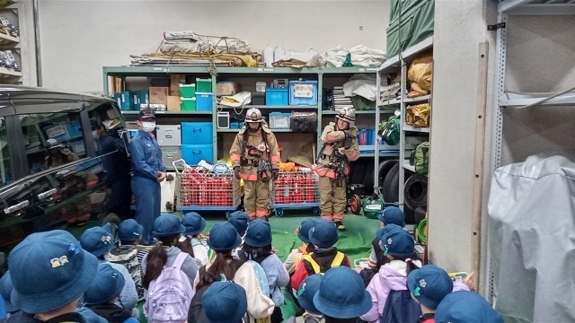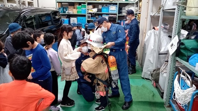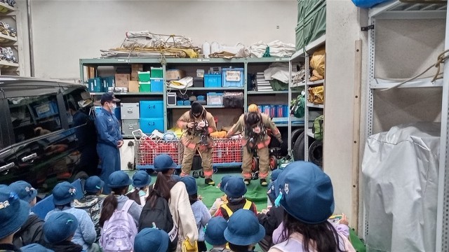 グループが入れ替わって、消防服を消防士さんが素早く着る様子を見せていただきました。その後、実際に着させていただきました。