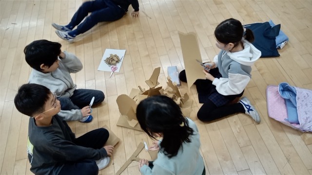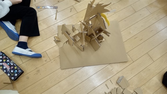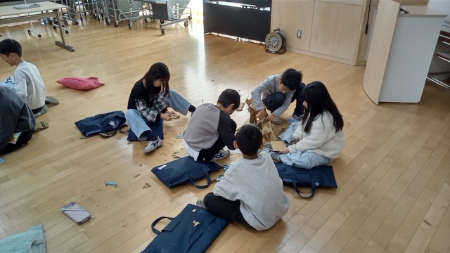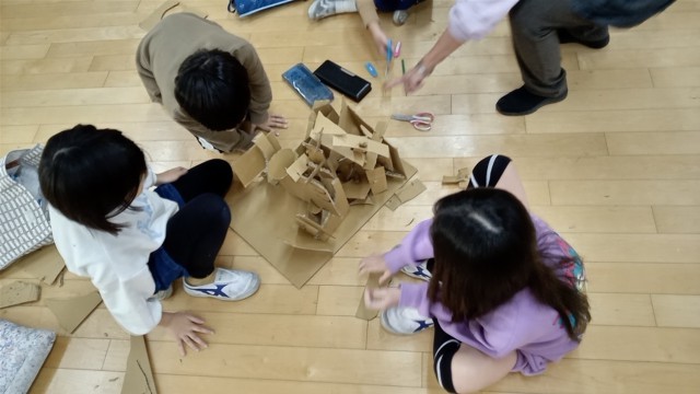 3年生がグループの共同作品で、段ボール紙を切って組み合わせて作品を作っています。仲よく協働作業をしています。