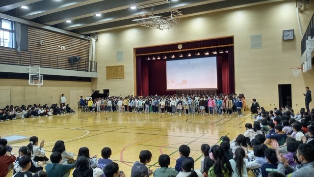 本日の音楽朝会は、1・2年生による合唱でした。元気よく歌っている1・2年生を他の学年の子供たちはよく聞いていました。
