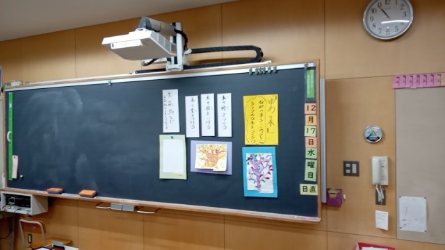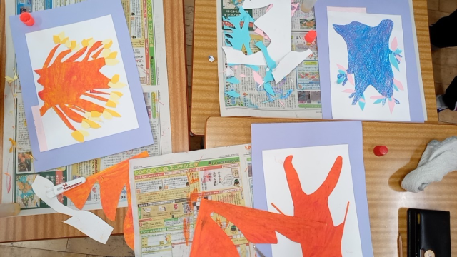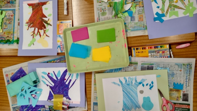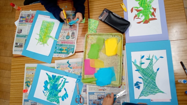 3年生の図工で、好きな色の紙を切り抜いて、自分で描いた木に貼り付けていきます。個性的な木がたくさんできています。