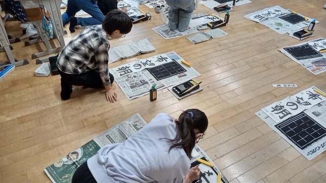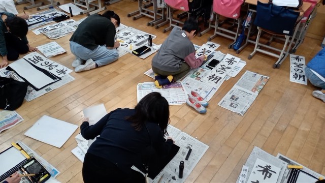 5年生が自分の教室で書き初め練習をしていました。とても静かに集中して書いています。