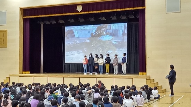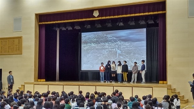 クイズ集会の後、SDGs委員会の発表がありました。昨年度に植えた4本の木の説明をしていました。