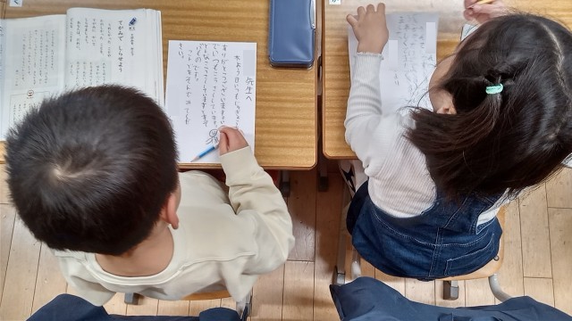 1年生の国語で先生に手紙を書く練習をしていました。先生や教科書のお手本を参考にして、用紙に手紙を丁寧にかいていました。