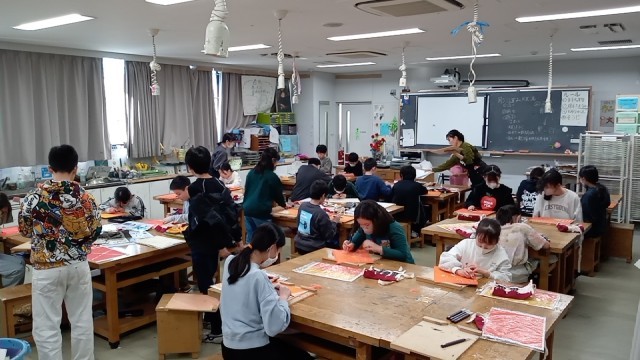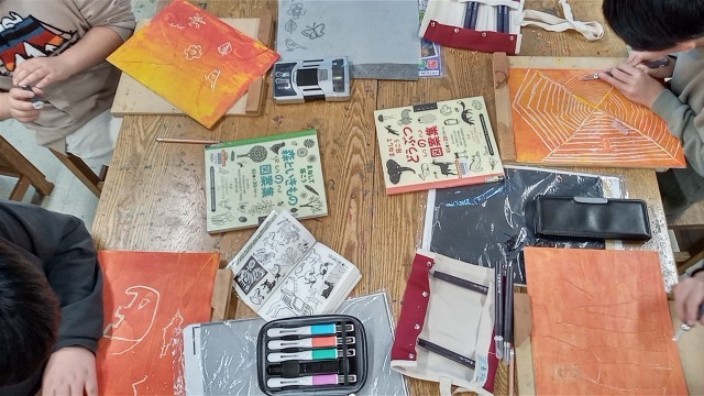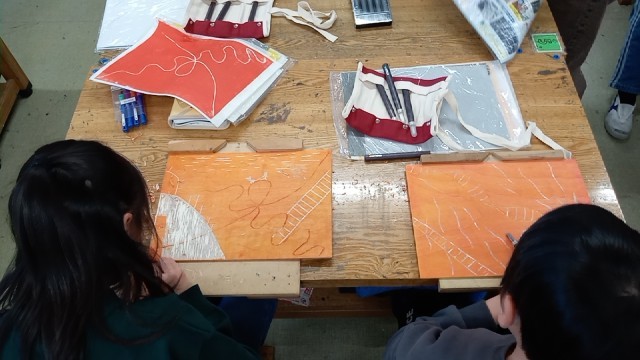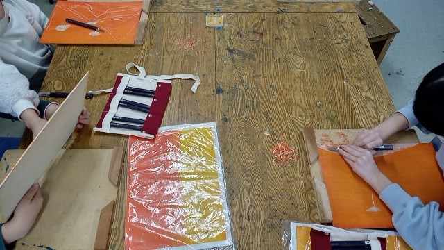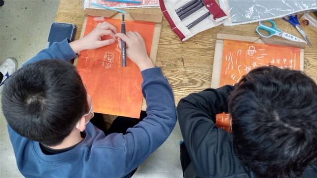 5年生が彫刻刀で版画を彫っています。手を切らないように両手を使って、削っています。