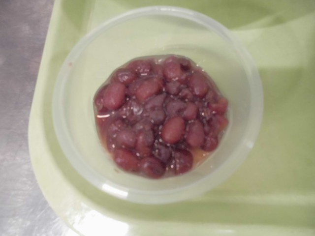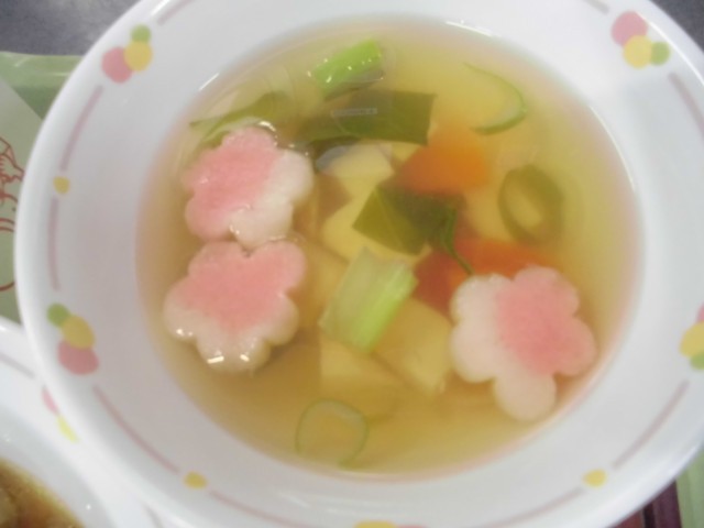 「梅の花すまし汁」には梅の花の形のお麩を入れました。ぜんざいは、給食室で小豆をやわらかく煮るところから作りました。