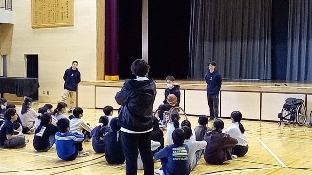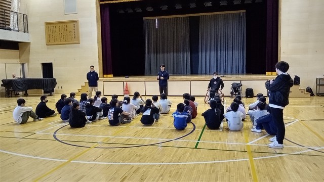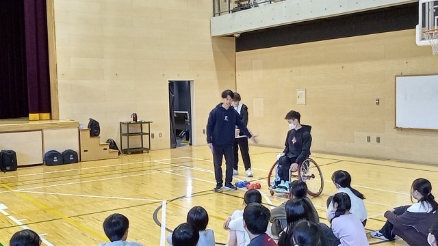 学級ごとに1~4時間目で行われました。最初に車いすバスケットボール選手に車いすバスケットボールのデモンストレーションを行っていただきました。その後ボッチャのやり方やルールを説明していただきました。