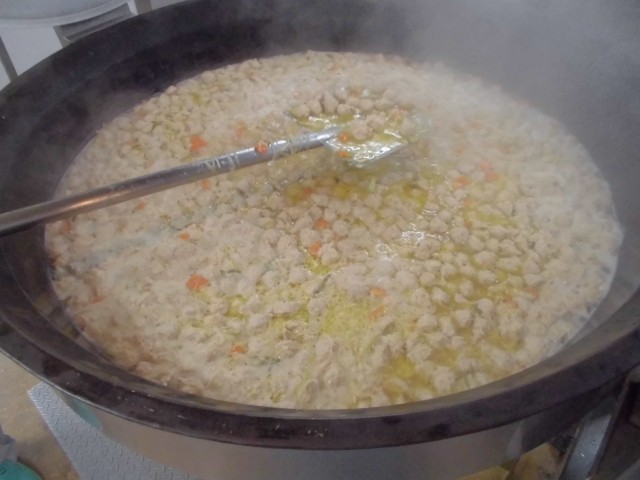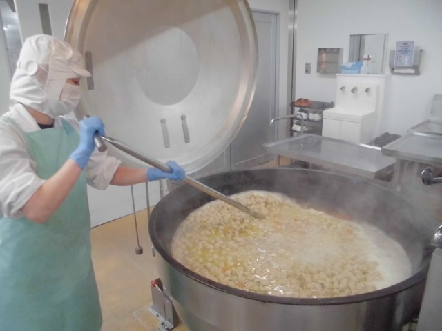 今日の給食では、給食室で、鶏肉団子を一つ一つまるめて作り、たくさんの野菜、豆腐などと一緒に煮込みました。