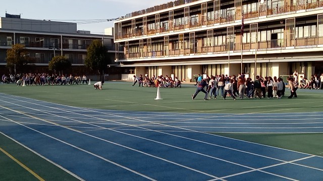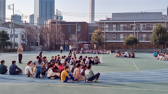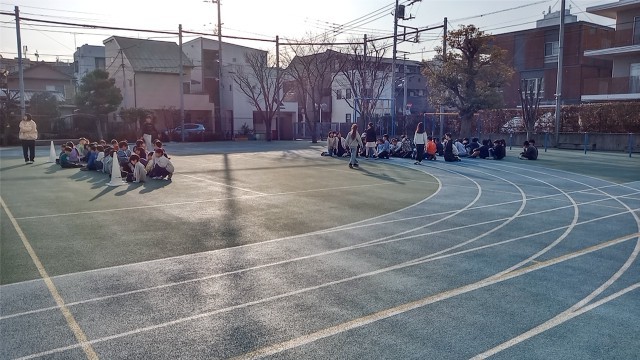 今朝の体育朝会は、マラソン大会に向けてマラソン練習の確認を行いました。本日は1・3・5年生です。最初に並ぶ場所の確認をした後、音楽に合わせて準備運動をしました。