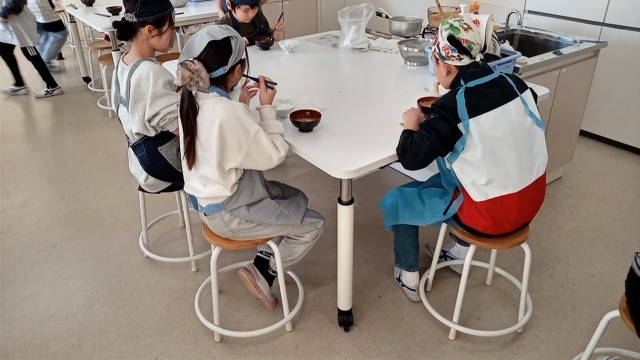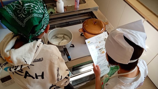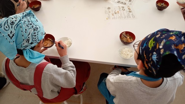 5年生のい家庭科の調理実習で。ご飯とみそ汁を作りました。煮干しからだしを取り、説明書を見ながら調理をしていました。ご飯もみんなうまく炊けたようです。自分で作ったものは、とてもおいしく感じているようでした。