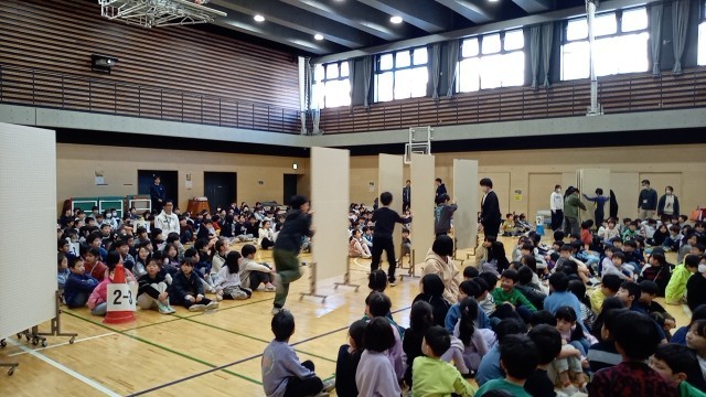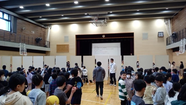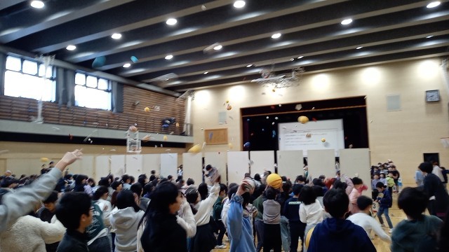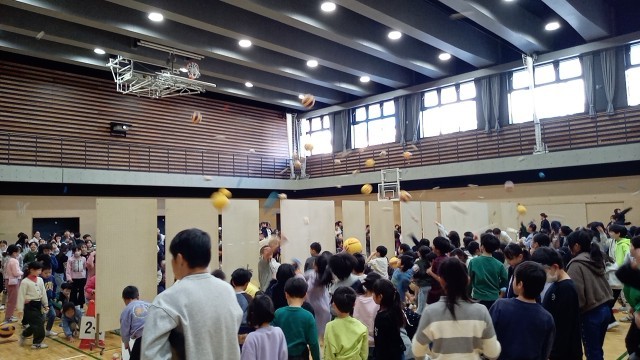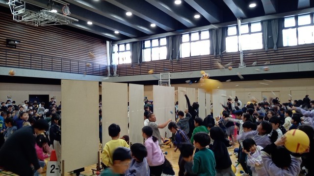 本日の児童集会は、「雪合戦」集会です。体育館で1・4・5年生と2・3・6年生と左右に分かれて、その間に仕切りを立てて、玉を投げ上げて相手の陣地に入れるゲームです。ボールは、新聞玉や紅白入れの玉、ソフトバレーボールなどいろいろあり、時間内に相手に向かって投げ合います。