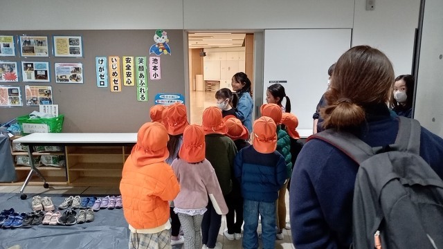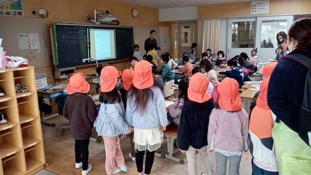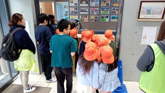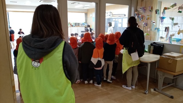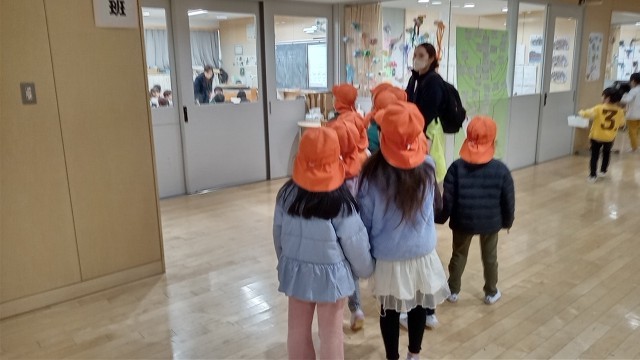 5年生が2・3階を案内したあと、1階は保育士と園児とで参観しました。園児たちは、子供たちの授業を受ける様子を注意深く見ていました。また、小学校の子供たちも、自分が保育園時代に見ていただいた保育士さんを見つけると、とてもうれしそうにしていました。