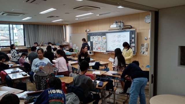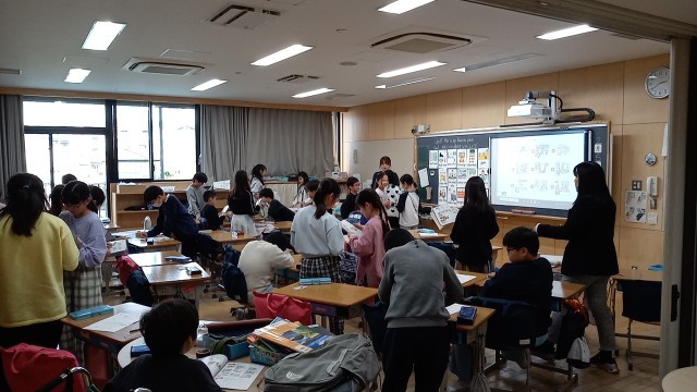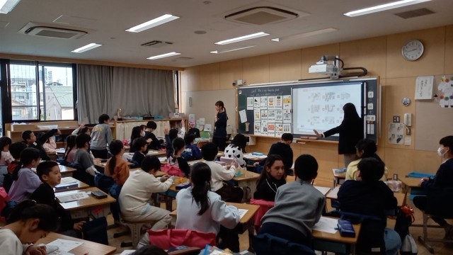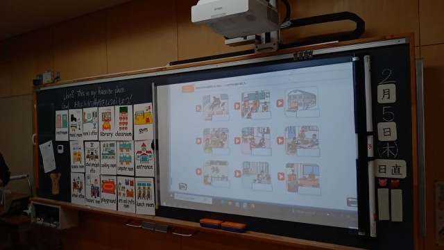 4年生の外国語活動で、学校の中の好きな場所について答える学習をしていました。