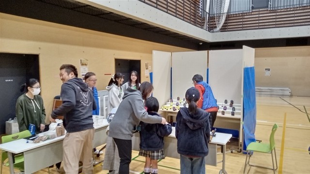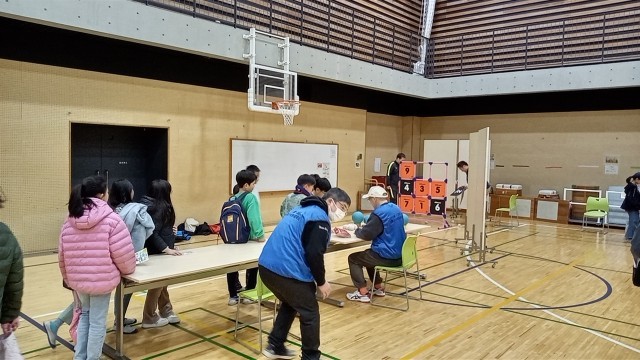 今年も小中学校の体育館を使って、第11地区青少年育成委員会主催のスポーツ・ゲーム大会が行われました。そして本校PTAの方、池袋中学校ボランティアの生徒たちにも協力をいただいています。小学校体育館では、ストライクアウト、射的、輪投げ、クイズなどが行われています。