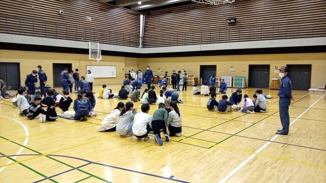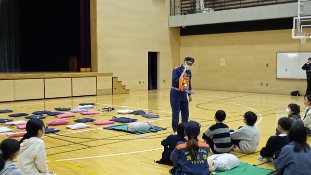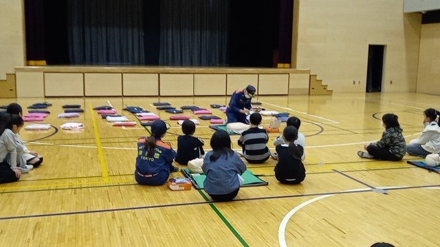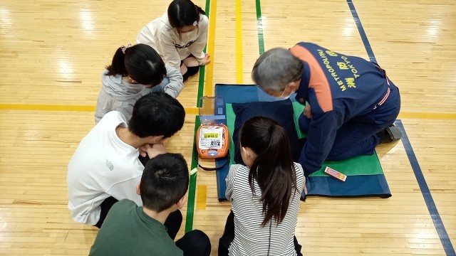 本日の1・2時間目にAEDの講習会を行いました。池袋消防署、及び池袋本町の消防団の皆様にご協力をいただき、4・5人ずつの班で指導をしていただきます。1時間目は1・2組が体験しました。