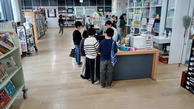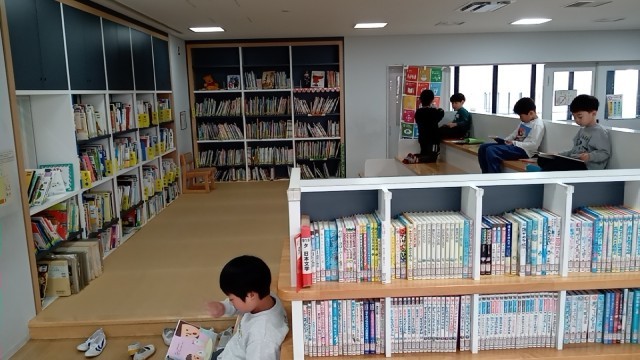 1年生の図書の時間です。図書館司書の先生の読み聞かせが終わった後、静かに読書をしています。