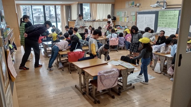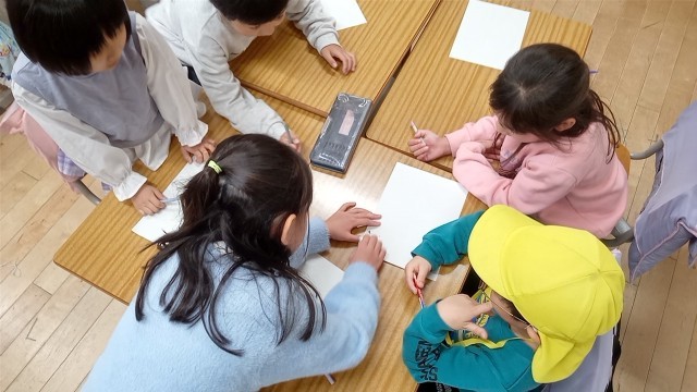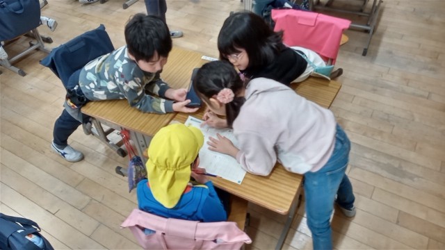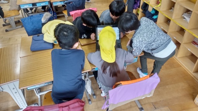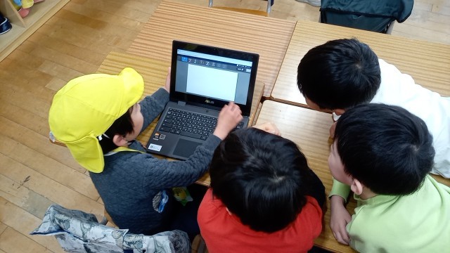 1年生がやさしく園児たちに教えています。タブレットの学習も行っていました。